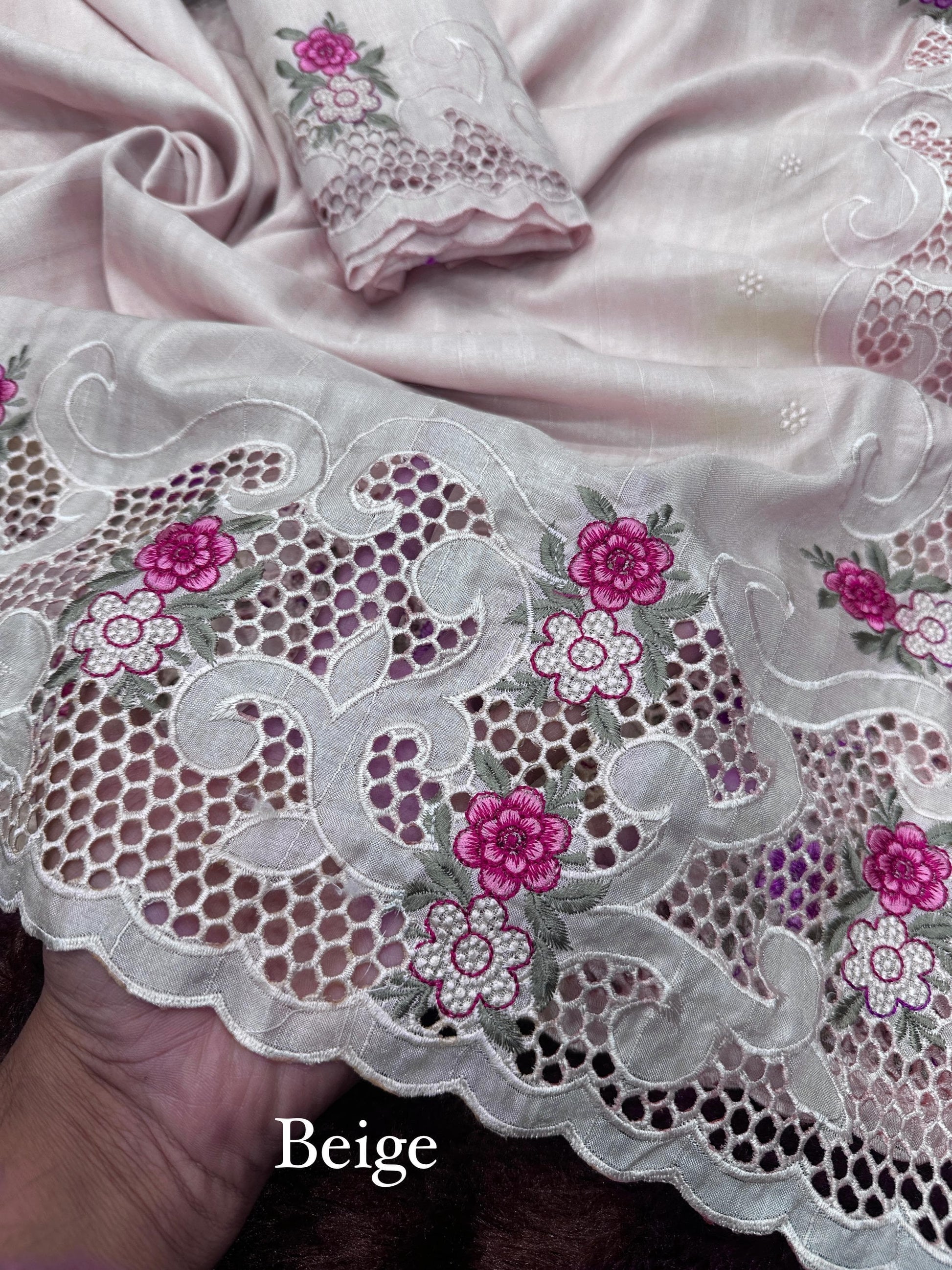 Step into timeless elegance with this White Tusser cotton saree, featuring intricate floral cutwork embroidery in pink and gold. Soft, breathable, and lightweight, this saree is ideal for festive gatherings, casual wear, or cultural events. Made from premium Tusser cotton, it combines traditional artistry with modern charm.